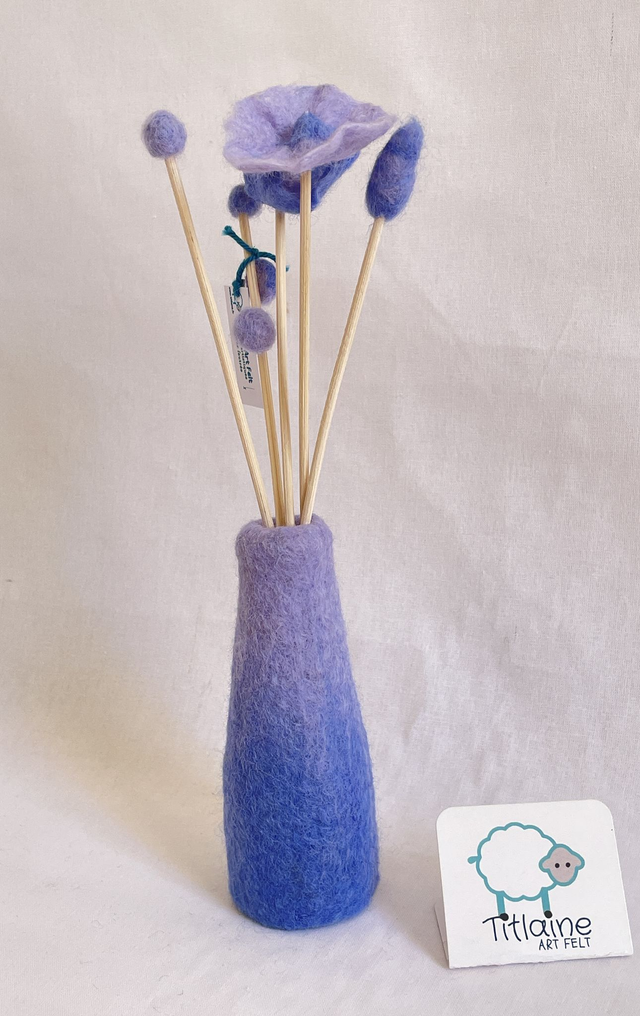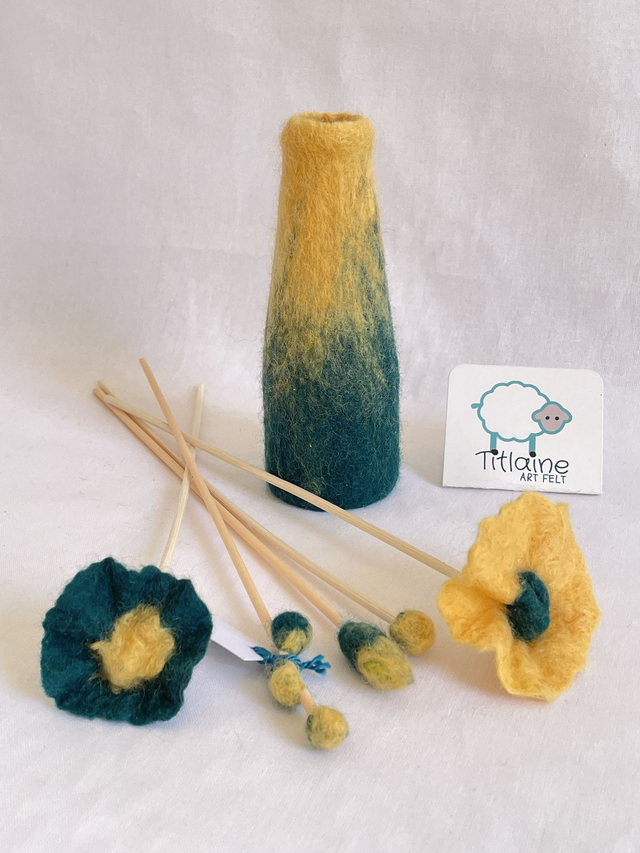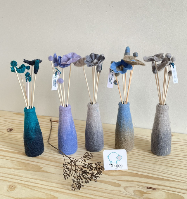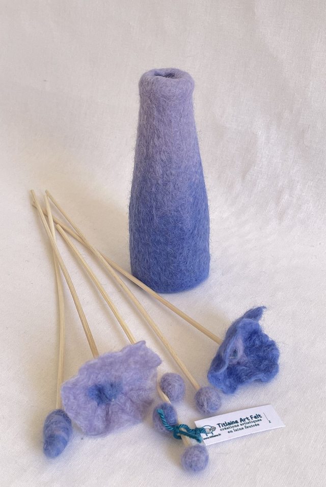 La laine mérinos est feutrée sur la bouteille en verre, sans couture. 5 tiges de rotin sont décorées de fleurs de laine. Mettre 2 cm d'un parfum d'ambiance, par capillarité le parfum remonte et diffuse discrètement mais longtemps l'odeur de votre choix ou posez des huiles essentielles sur les fleurs.