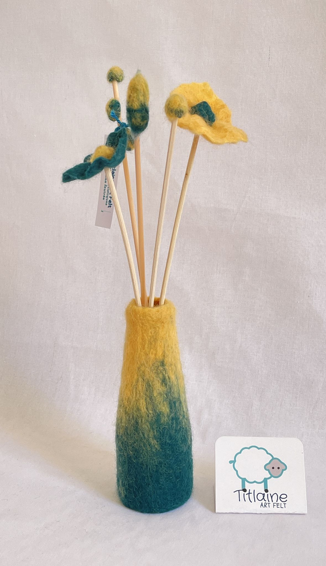 un mini vase recouvert de laine feutrée et 5 tiges de rotin naturel