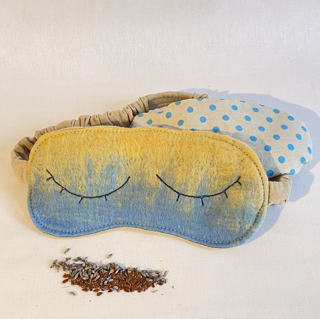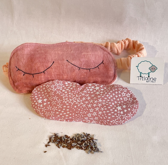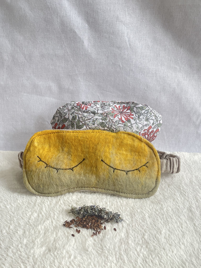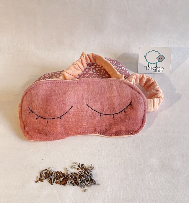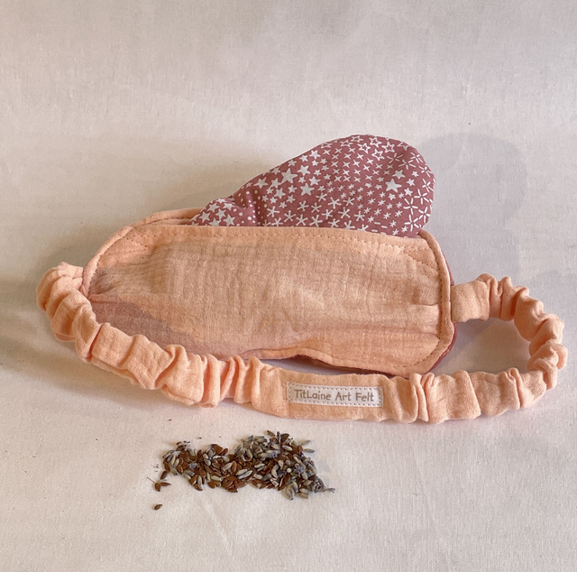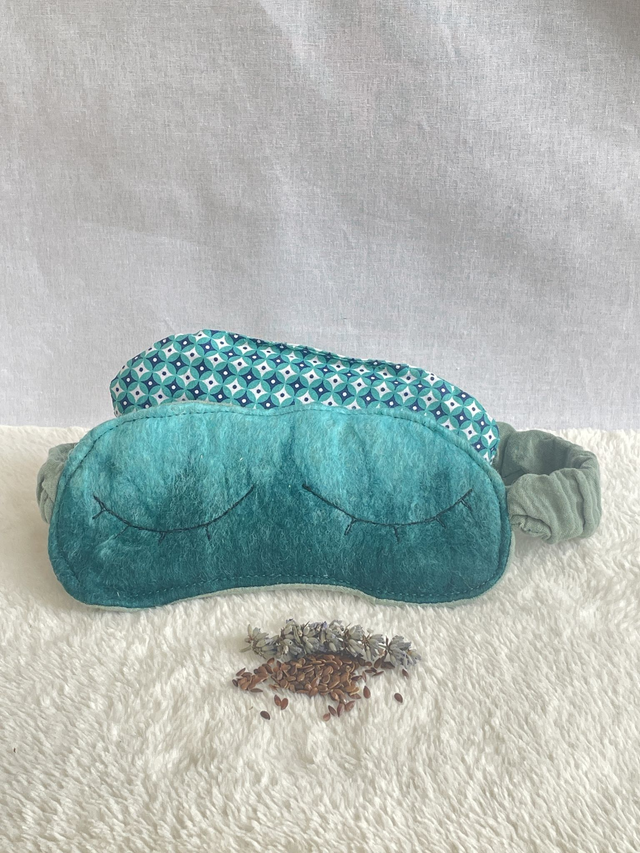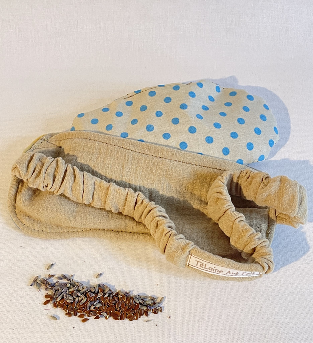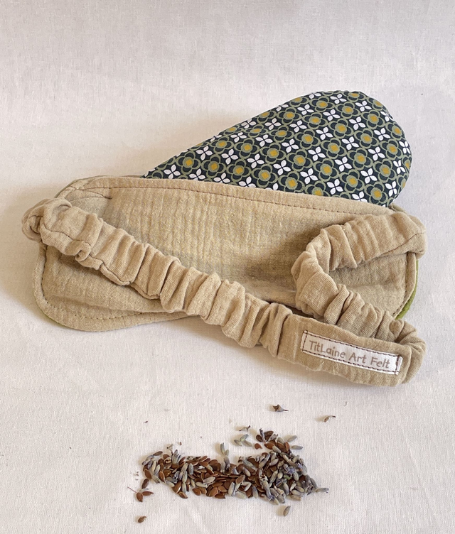 Composition : Un masque avec élastique, face avant feutrée à la main avec de la laine mérinos sur de la gaze de coton. On y insert le coussinet de 110g de graines de lin bio et fleurs de lavande du jardin.