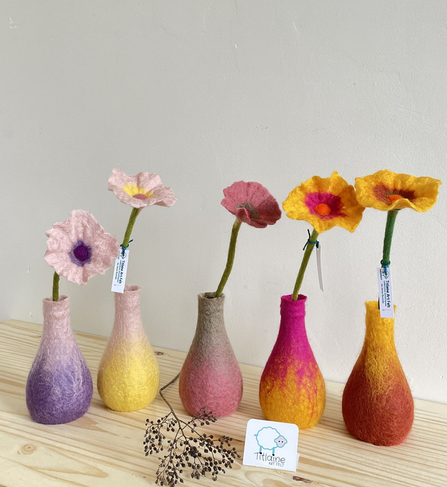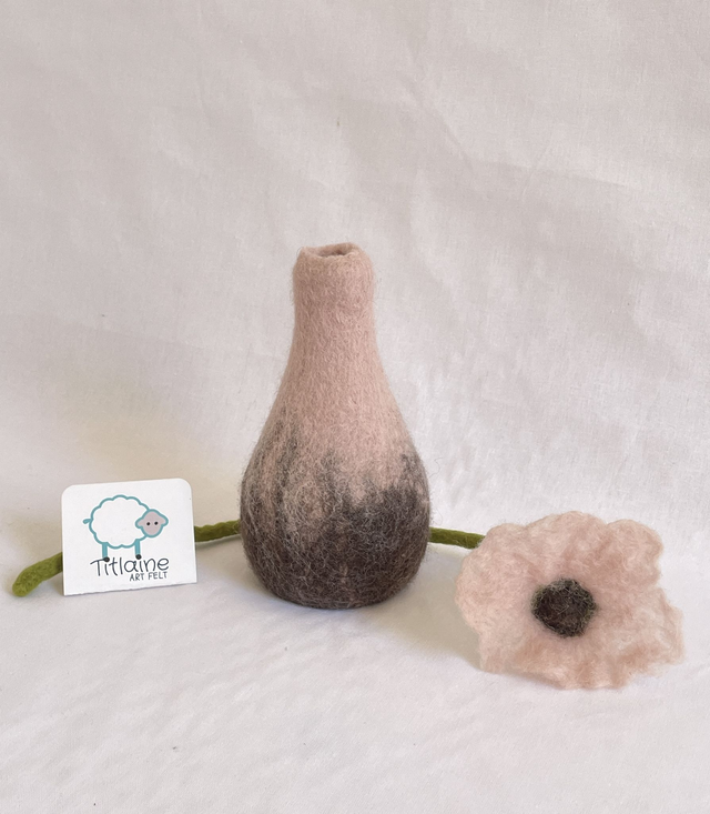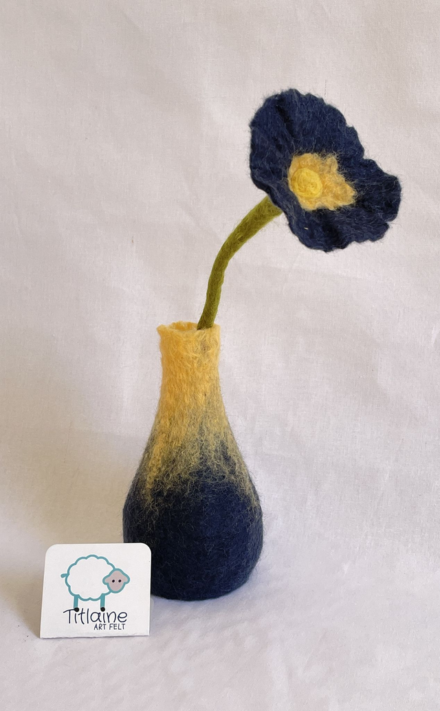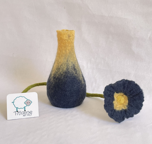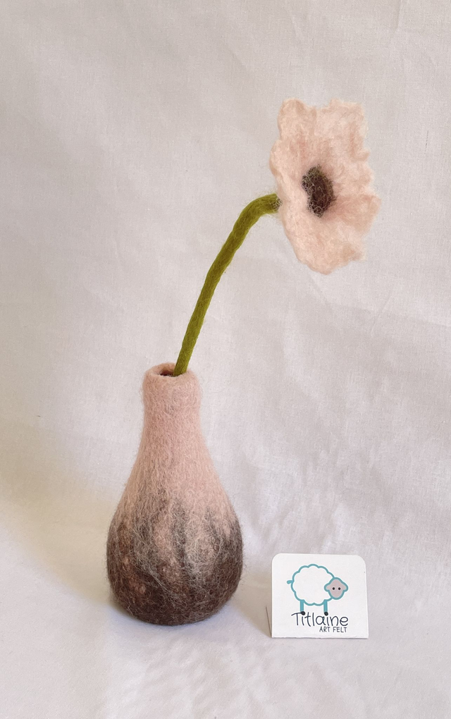 un mini vase recouvert de laine feutrée et sa fleur de laine articulée