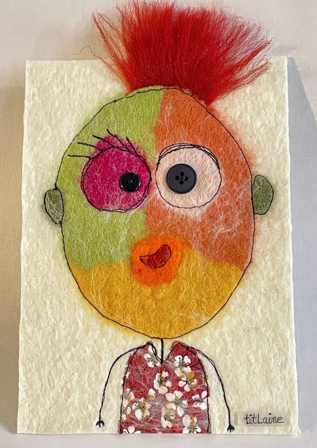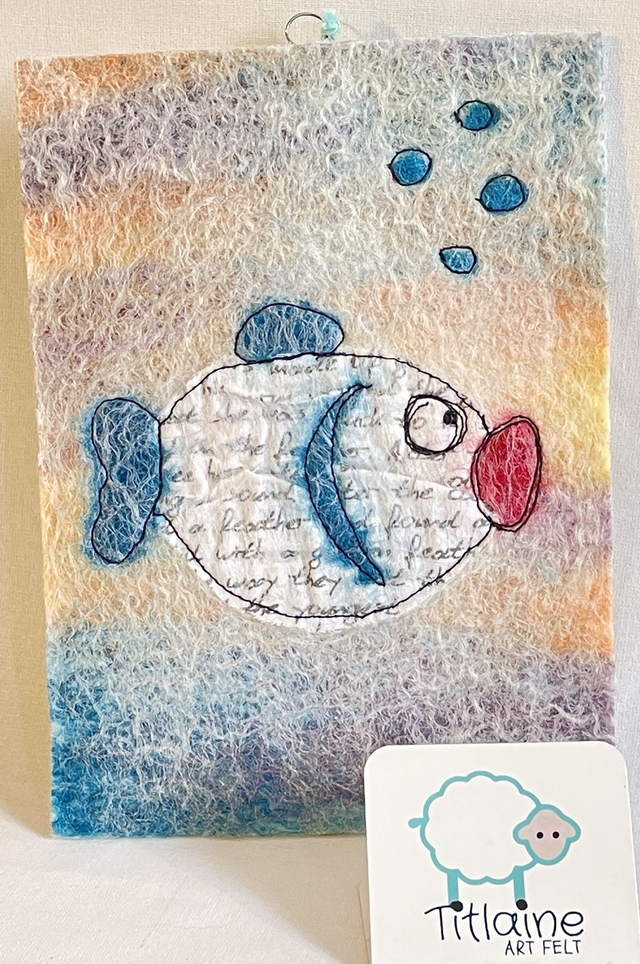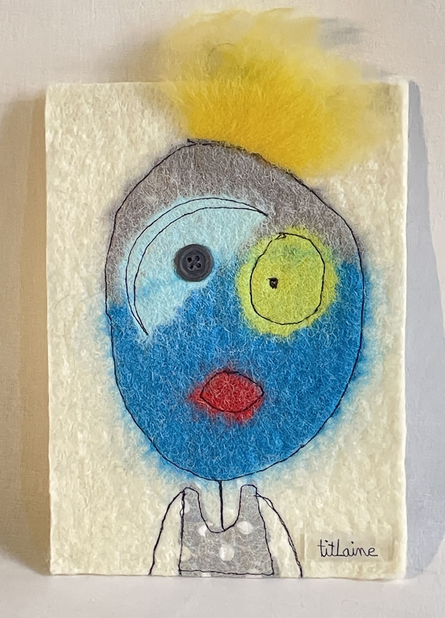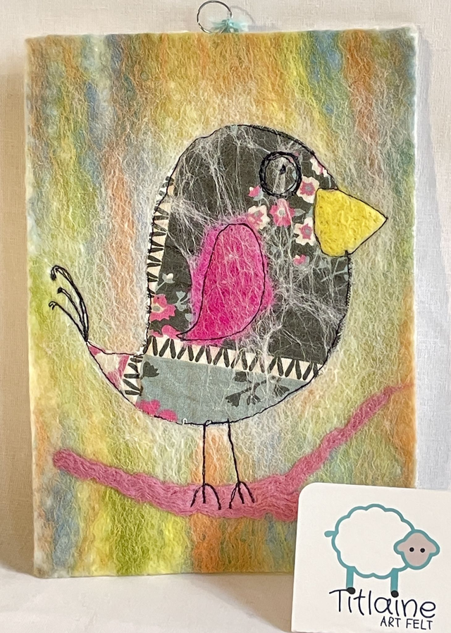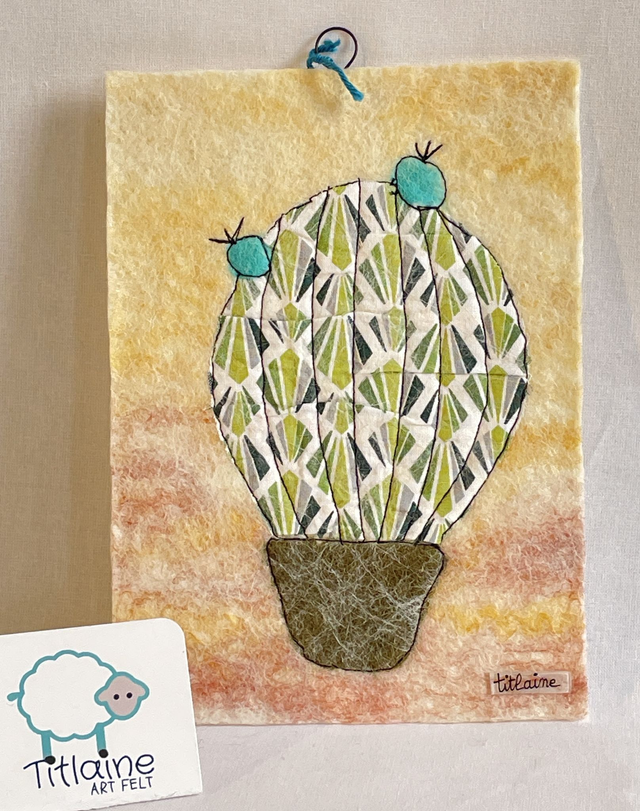 Un doux mélange de fibres naturelles : le coton imprimé est feutré, incrusté dans la laine mérinos puis une couture libre marque les contours.
